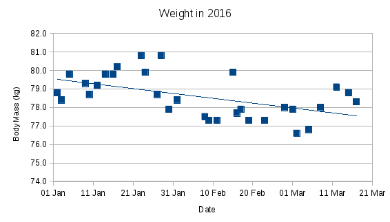 | Weight | 0 | 21 Mar 2016 | This graph is awesome because I saw no trend at all until I graphed it, and now the trend is clear. It's also awesome because I'm losing weight!