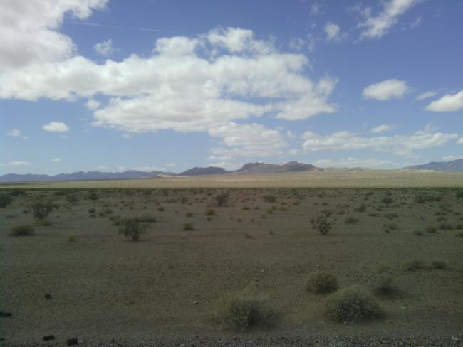 After some water, granola bars, and a bearclaw for breakfast, I got back on the bike around 8:00. I rode past sand, sand, sand, and more sand. And at one point I made a left turn. The desert was actually quite beautiful, and despite the two big climbs today it was a net elevation loss which was good on the legs. I took rest stops at the 40, 70, and 90 km marks to eat some sandwiches I had picked up the previous night and let the legs rest. By 1:30 I arrived at Vidal Junction, my planned stop for the night. The stop is nothing but a single gas station, but a much needed one. In the parking lot I met another cyclist named Ray who was going from the San Francisco bay area to Columbus, OH. He ride a recumbant bike which he spoke highly of, and it looked good to me because it has a full seat, and by day three my butt is getting sore.