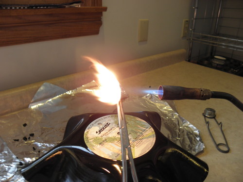 Vinyl directly in the torch flame. Note that the vinyl is not on fire.