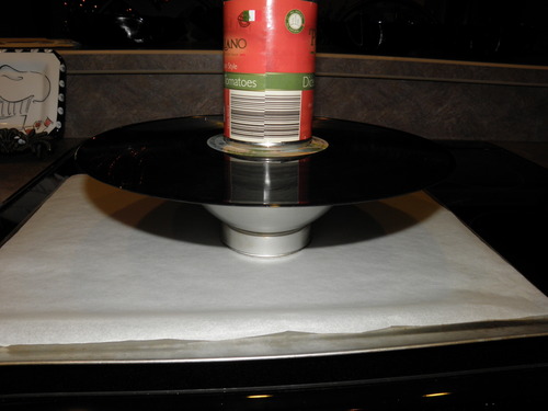 To begin, place a bowl upside down on the baking sheet, and set the record on top of the bowl.