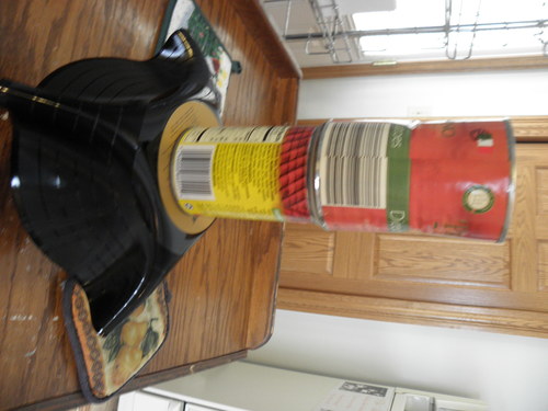 The can here is being used for weight to help push the record farther into the bowl it is on.