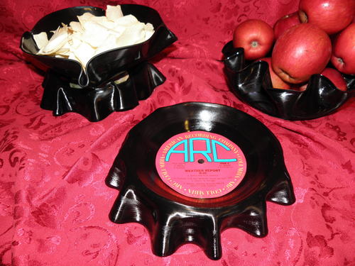 You can control the shape of the bowls more precisely by molding the records while they are still pliable. It will probably be helpful to increase the oven temperature to soften the records. You may also find it useful to push or pull on the records while they are still in the oven. But be careful; it is, of course, hot in there.