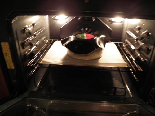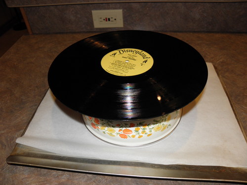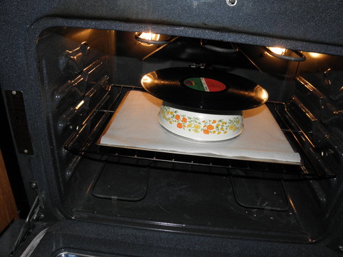 Place the configuration in the oven, and heat to to anywhere between 90° and 120° C. (200° to 250° F). The record should take about a minute or so to begin melting.