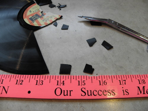 So far these record bowl are great for things like fruit that are pretty big, but they aren't very good for snacks like pretzels because of the hole in the center. In order to plug these holes you'll need a propane blow torch. The first step is to cut a little square, about 2cm on the side, of vinyl out of a spare record.