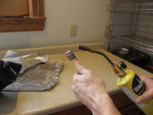 After striking the blow torch and adjusting the flame, use some kind of tongs to hold the vinyl square directly in the flame. Only torch the vinyl long enough to get it soft, not long enough to catch it on fire.